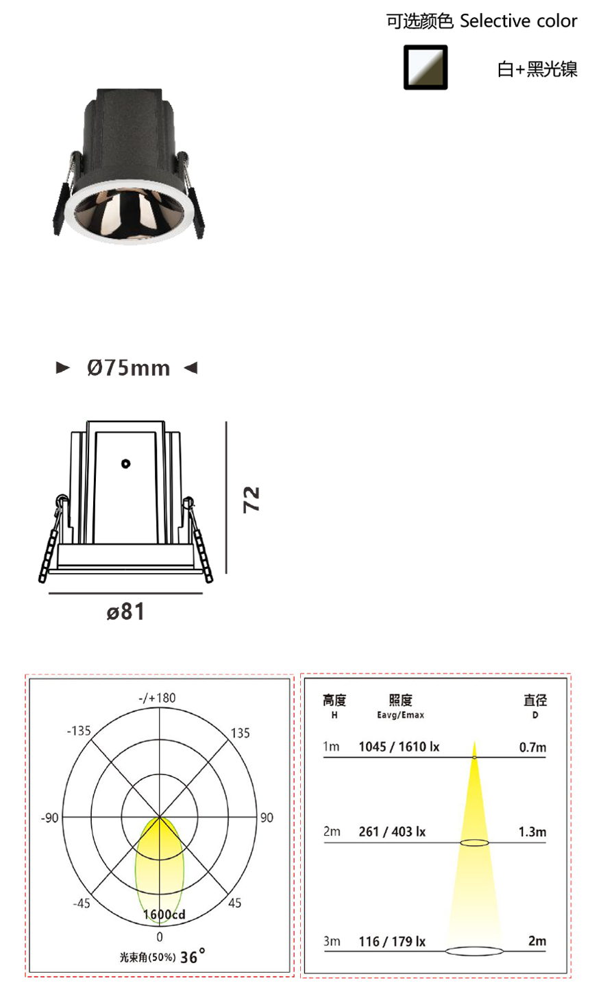 灯具散热器和弹簧扣胶垫处融入了魔方的方块格元素 ,高纯度压铸铝一体成型,大空气接触实现强劲散热,寓意着无限的可能性和变幻的魅力 ;灯具可调角及防漏光设计,可根据不同需求自由调节出光方向 ,环绕挡边,偏转时不漏光,提高整灯光效,降低能耗;灯具四重防眩设计,深藏光源,舒适遮光角度 ,高品质透镜,光斑均匀,黑光镍反光杯,减低眩光。