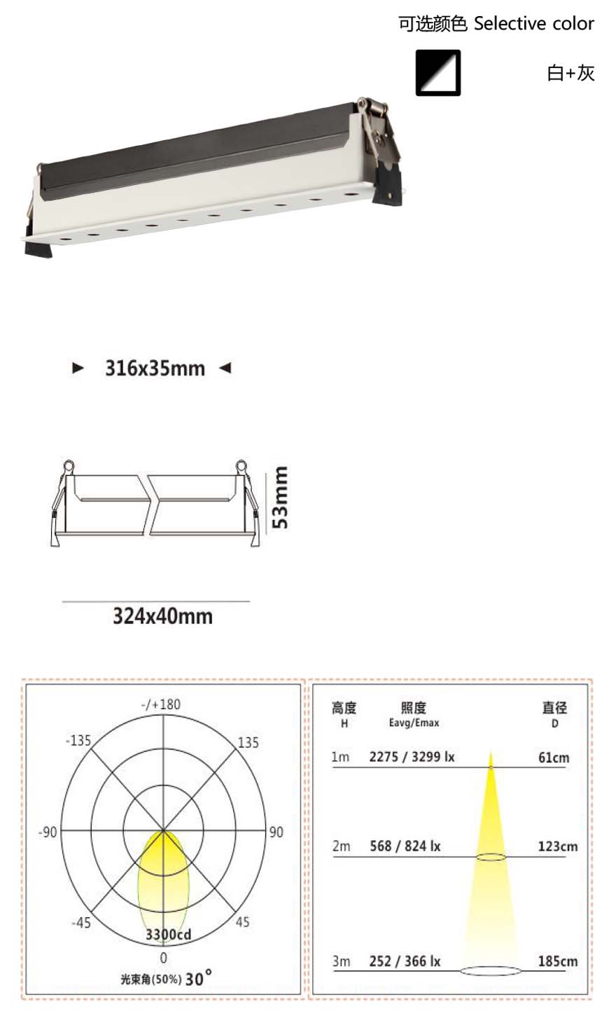 灯体使用压铸铝工艺制成,造型简约大方,结构安全稳定,光源采用进口普瑞光源,具有高显色性高灯具效率、超长寿命等特点精准配光设计,提升产品出光利用率,整灯灯具效率高,真正做到经济节能、高效;本系列产品具有多种规格可选模组透镜经特殊的光学处理,搭配防眩圈,防眩效果出色