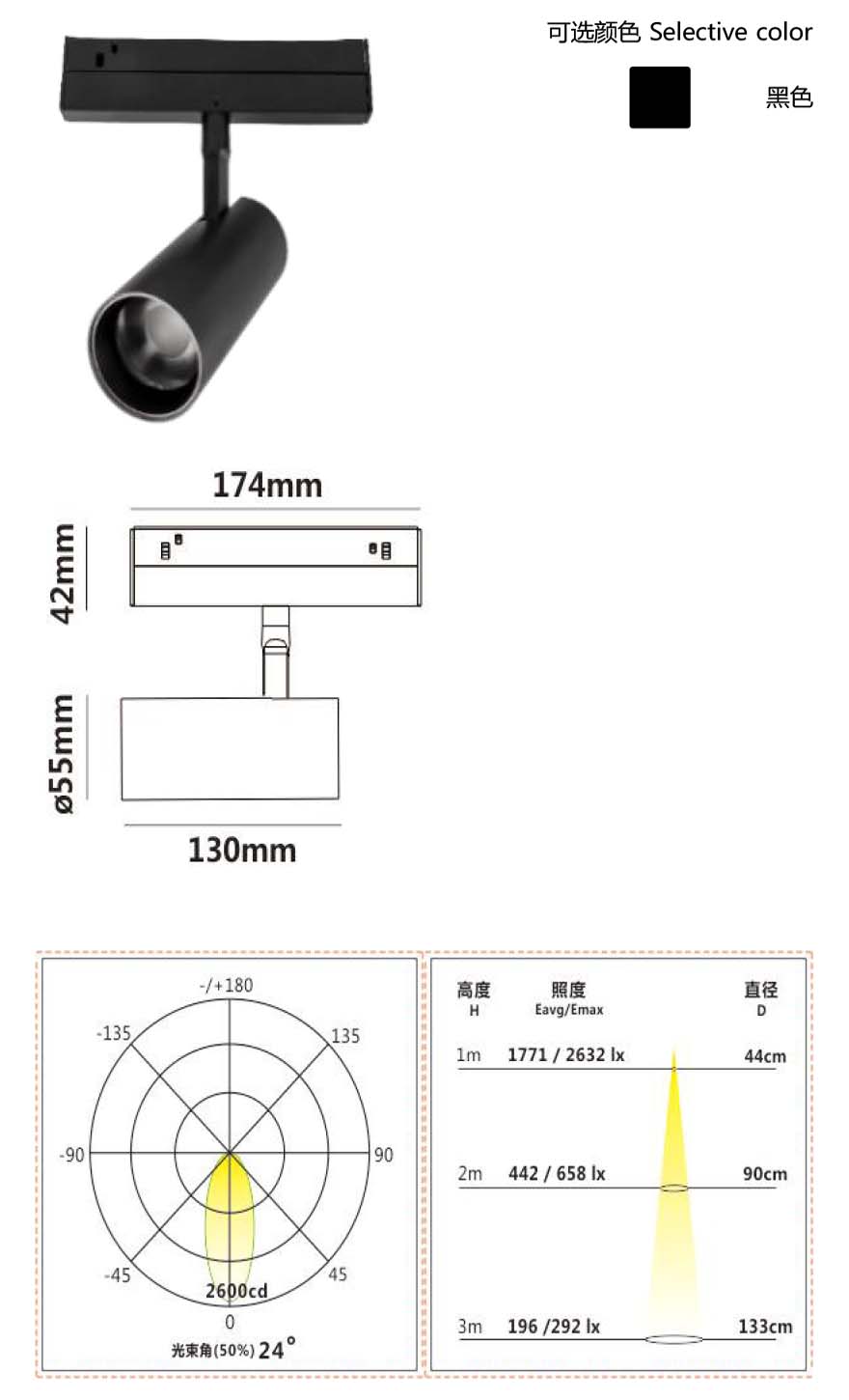 48V低压电路设计,通电后也可安全触碰保证使用安全采用磁吸系统,灯具可以直接插入轨道,自由移动替换,竖装不掉落配合有L型I型等各种连接接驳,安装简单自由;可折叠产品结构,实现大角度的照射方向调节,适用于多种使用场景灯具设计有两种出光规格,窄光束的透镜和宽光束的扩散板,同一灯具实现多种效果