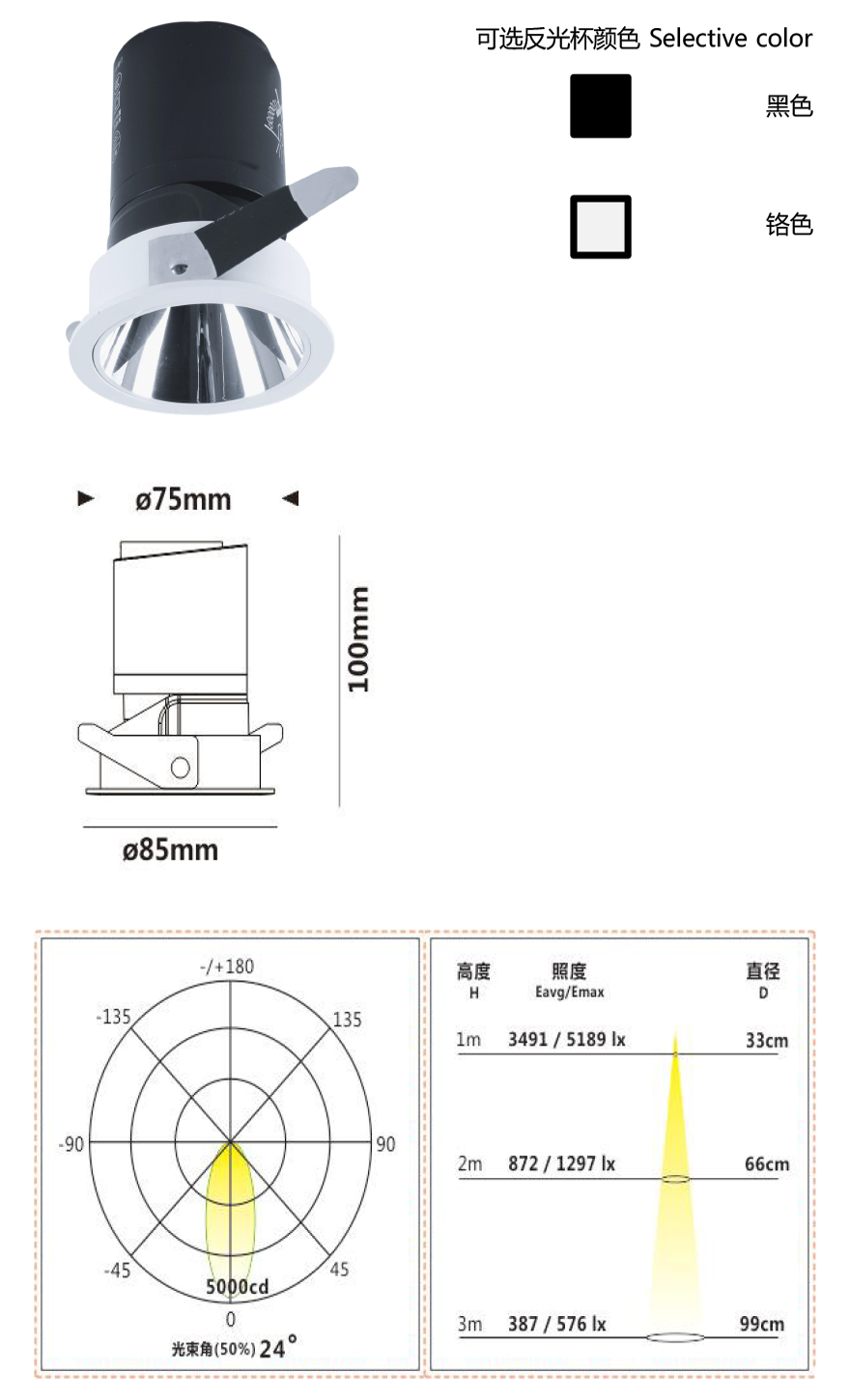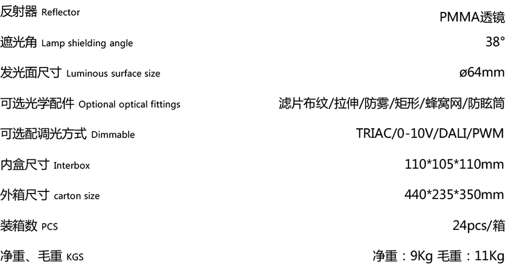 灯体材料使用高纯度铝和 PC材料组装而成,表面采用高温烤漆和电镀处理工艺,灯具具备调角、直下、无边框预埋等规格可选,部分产品还可选择偏光,的款式。多种出光口配件可选,组合后实现多样出光效果。标配3500K与KEEY-BUS调光调色开孔尺寸广泛,从直径55mm到直径150mm;采用进口COB光源,搭配企一集团公司自主研发高精度恒流控制器经济节能,安全稳定