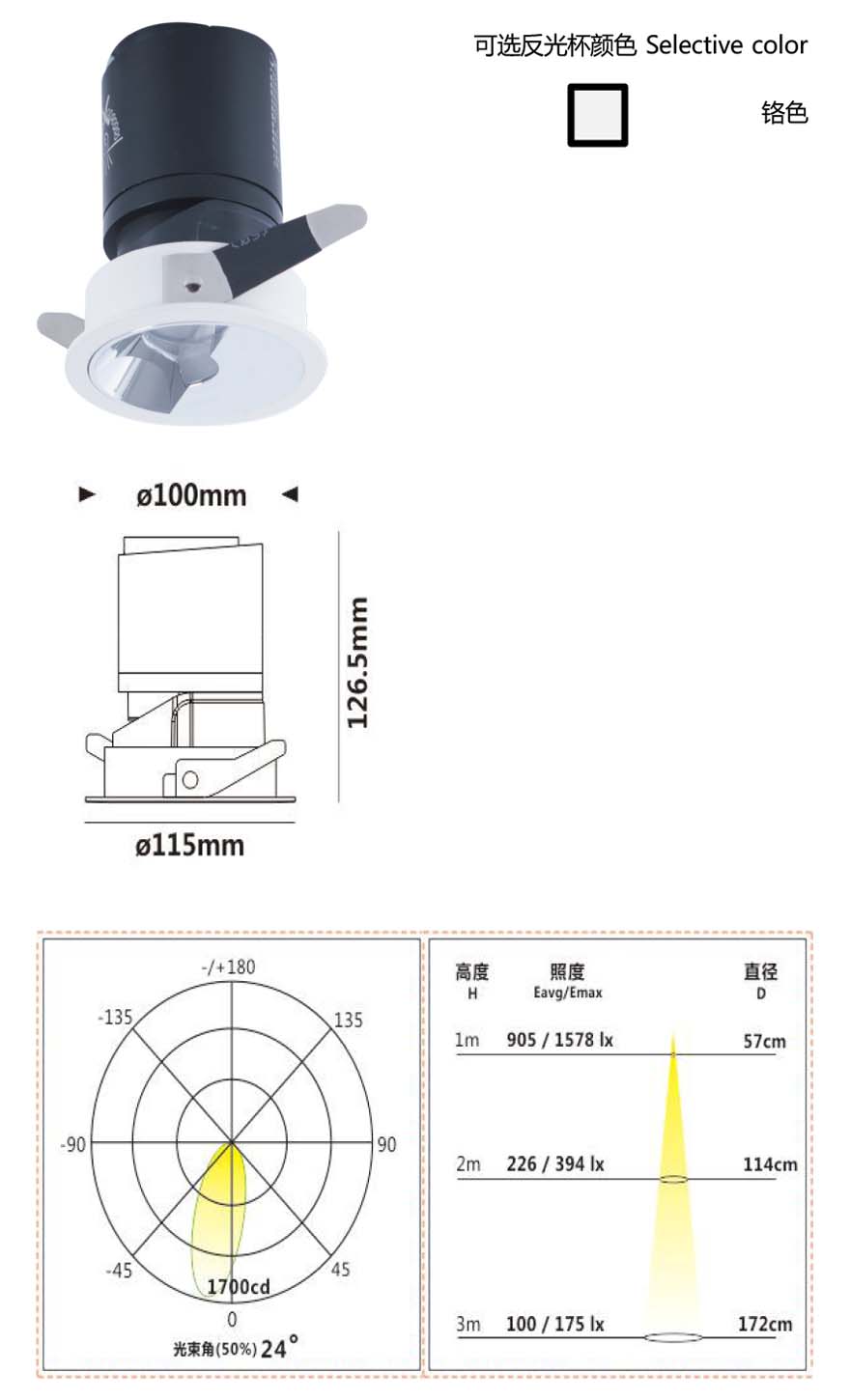 灯体材料使用高纯度铝和 PC材料组装而成,表面采用高温烤漆和电镀处理工艺,灯具具备调角、直下、无边框预埋等规格可选,部分产品还可选择偏光,的款式。多种出光口配件可选,组合后实现多样出光效果。标配3500K与KEEY-BUS调光调色开孔尺寸广泛,从直径55mm到直径150mm;采用进口COB光源,搭配企一集团公司自主研发高精度恒流控制器经济节能,安全稳定