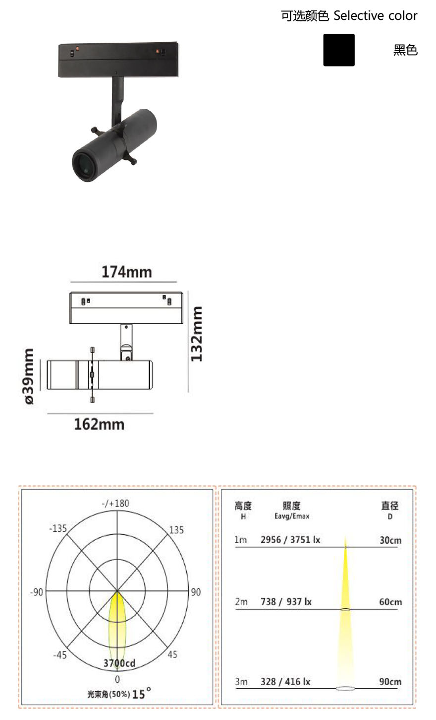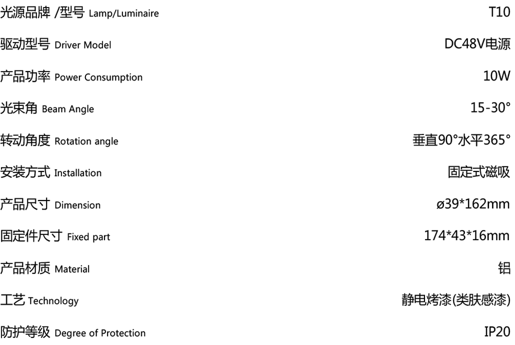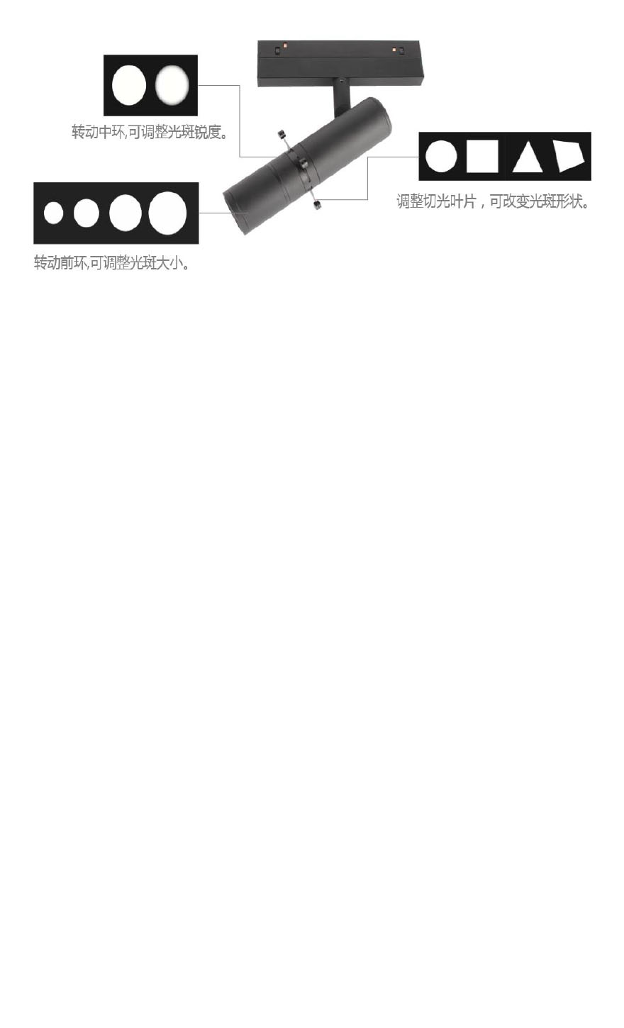 灯具外壳为静电烤漆(类肤感漆)工艺,整体质感较强;灯具具有两路滚动调焦和四片遮光叶片 ,自由调节光斑;水平355垂直355度的灯头调节角度,自由定向,无极调光调色,方便多种安装与照射目标的需求;48V低压电路设计,通电后也可安全触碰保证使用安全 ,采用磁吸系统,灯具可以直接插入轨道,自由移动替换