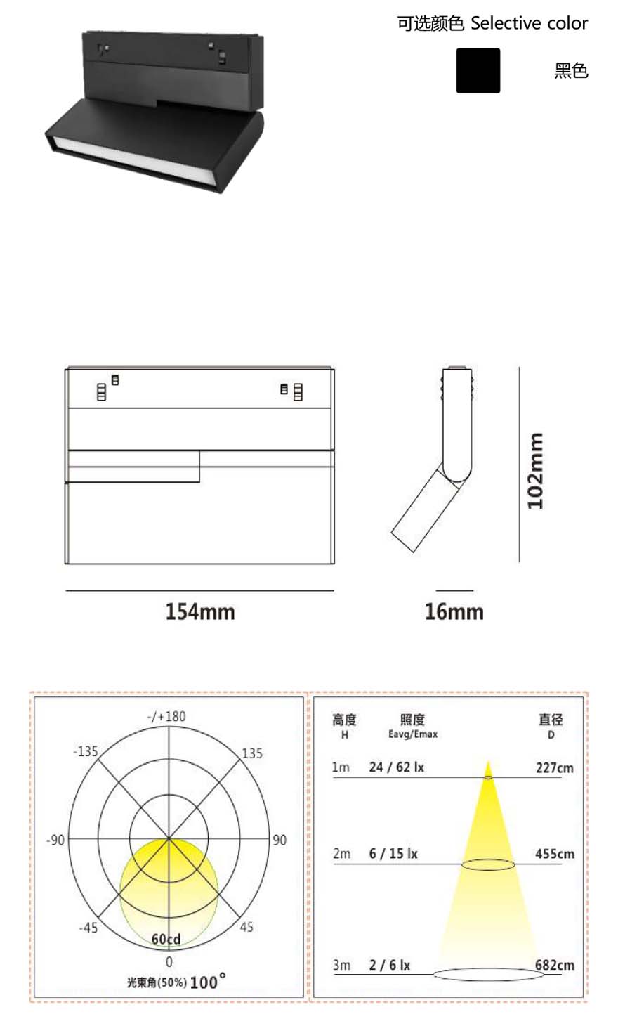 48V低压电路设计,通电后也可安全触碰保证使用安全采用磁吸系统,灯具可以直接插入轨道,自由移动替换,竖装不掉落配合有L型I型等各种连接接驳,安装简单自由;可折叠产品结构,实现大角度的照射方向调节,适用于多种使用场景灯具设计有两种出光规格,窄光束的透镜和宽光束的扩散板,同一灯具实现多种效果